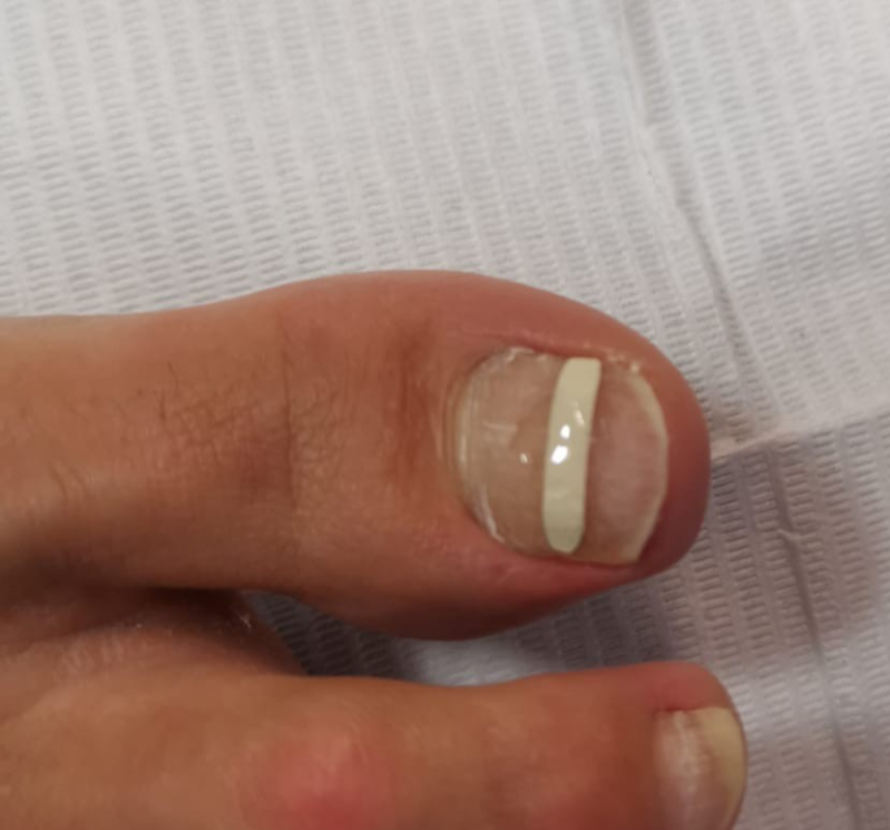 Plakbeugel (onyclip), deze beugel wordt op maat gemaakt en op de nagel geplakt. De druk wordt direct uit de nagelwal weggehaald. Toepasbaar bij o.a. ingroeiende nagels en tunnelnagels.